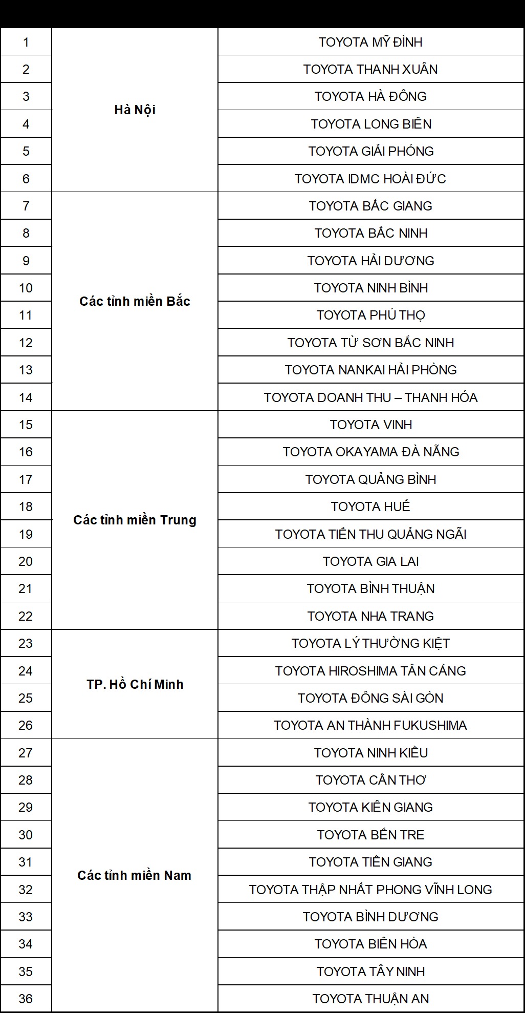 *Lưu ý: Danh sách đại lý áp dụng có thể thay đổi theo chính sách hợp tác giữa Toyota Việt Nam và các đại lý ủy quyền.